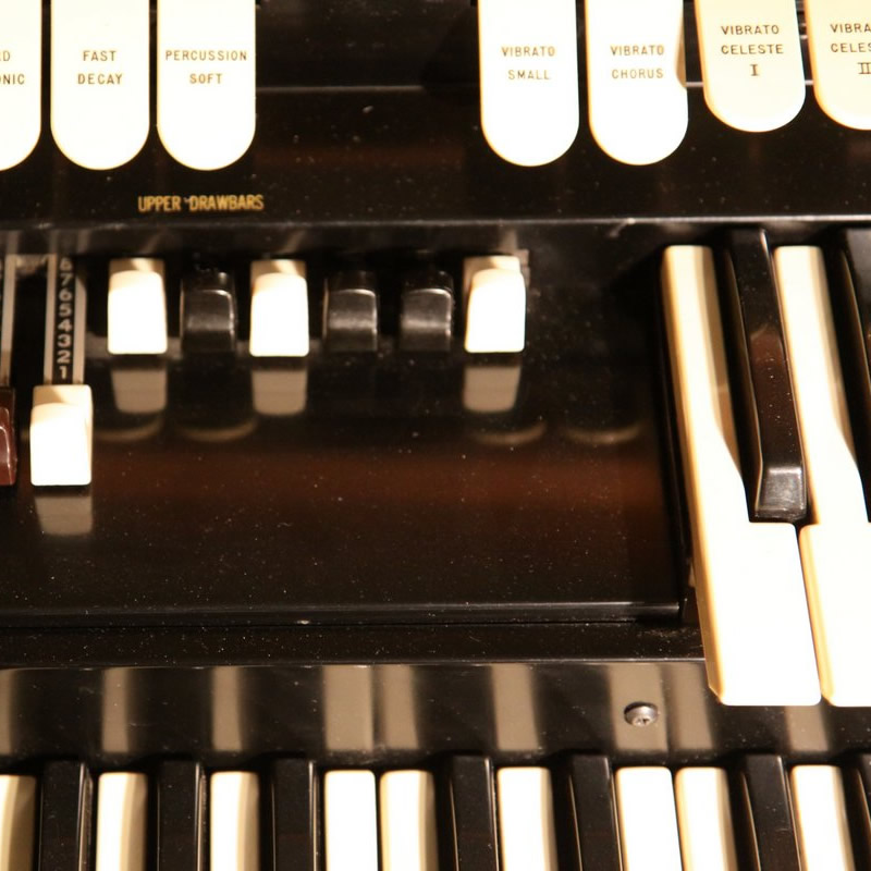 Die beliebteste und am meisten gesuchte bzw. verkaufte Hammond-Orgel, mit der Bezeichnung „Home Model“, mit Vibrato und Percussion, Vollorgel inkl. 25-tönigem Basspedal, verschiedene Holzvarianten wie Nussbaum, Kirsche, Eiche hell, ca. 180 kg (inkl. Pedal und Bank),